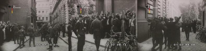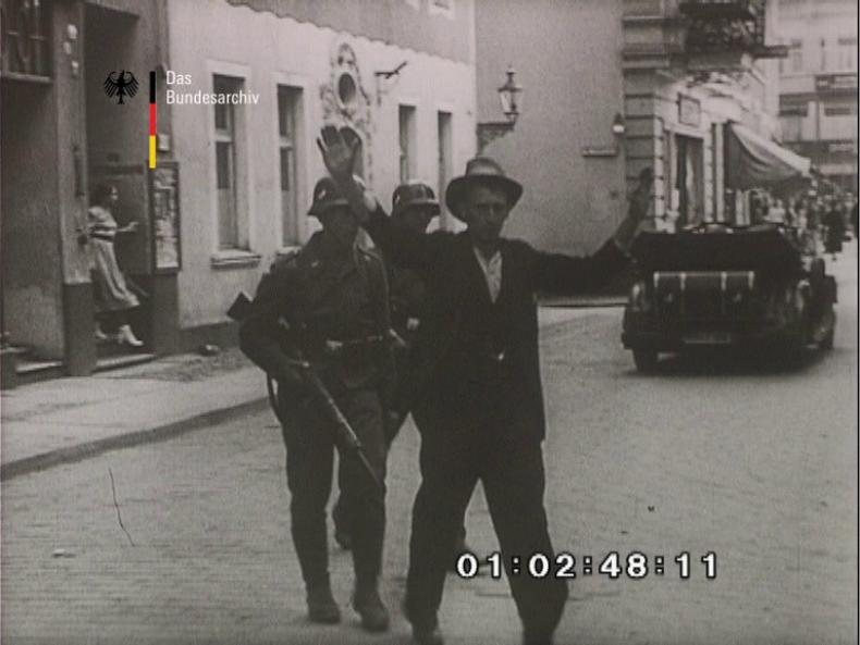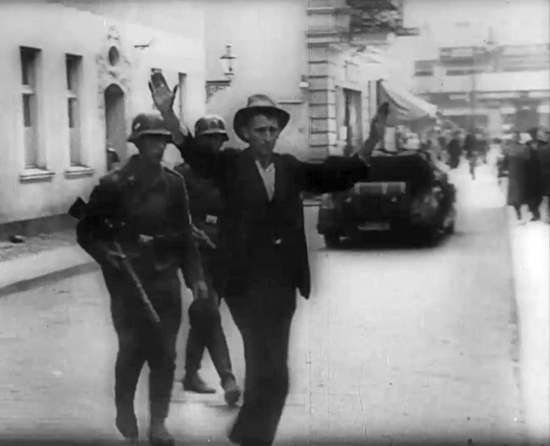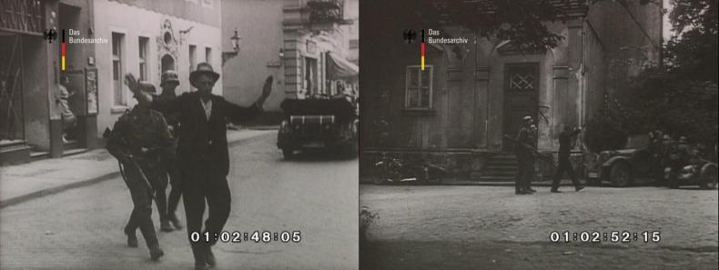 The footage from Bydgoszcz, which constitutes the first half of the second segment of UTW 471, starts at the 2:25 minute mark, and runs for approximately thirty seconds. It consists of eight shots. Male civilians are rounded up in the streets at gunpoint, many of them with their hands raised above their heads. German Luftwaffe (air force) soldiers are visible in some of the shots. One civilian, with rifles trained at him, is seen being led away. The corresponding voice-over starts shortly before the images, setting the scene: