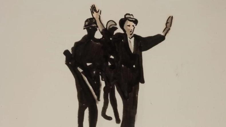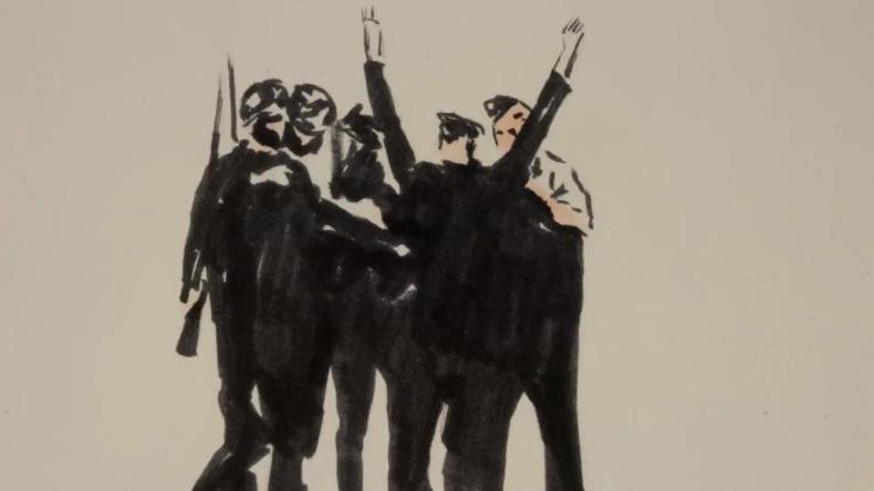 Figures 19–20: Another example of image alteration, using shots from the Bromberg footage as the basis for frames redrawn as watercolor images, from the TV documentary THE NUMBER ON GREAT-GRANDPA'S ARM (Amy Schatz, USA 2018). This documentary appropriates a number of well-known film materials from the Nazi era in this fashion.