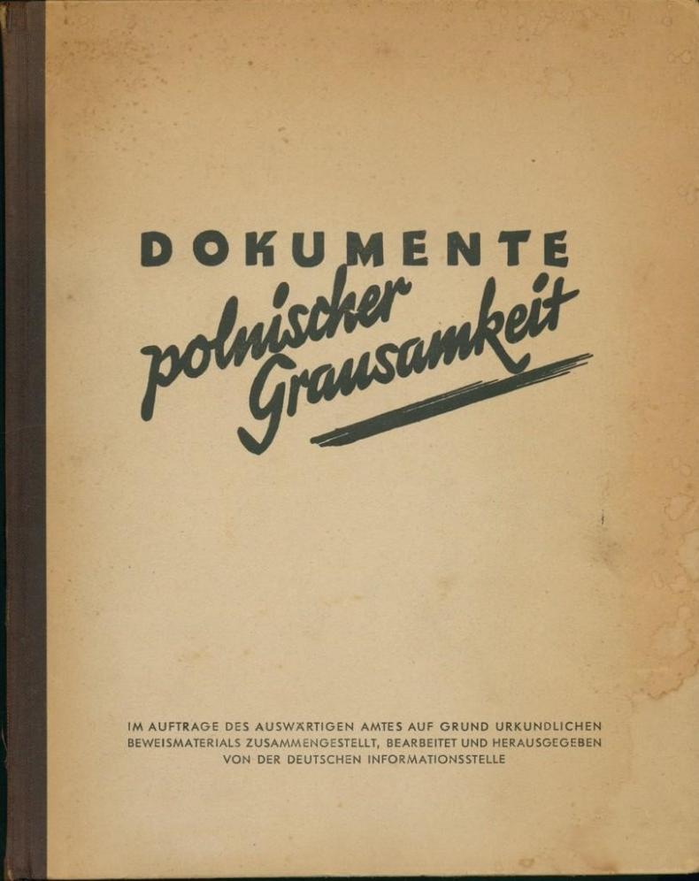 Figures 1–2: Hans Schadewaldt’s "Die polnischen Greueltaten an den Volksdeutschen in Polen" (Berlin 1940), reissued in its third printing as Dokumente polnischer Grausamkeit, is paradigmatic for the German propaganda campaign seizing on the Bloody Sunday. Edited as an official publication of the German Foreign Ministry, the book was also published in English, Spanish, French, Hungarian, and Romanian.