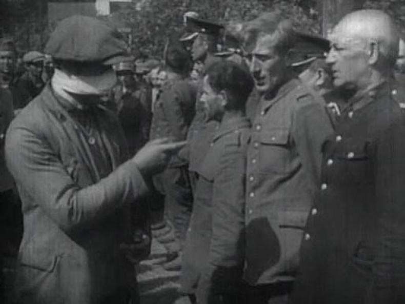 Almost as an afterthought, additional footage on Bydgoszcz was published in the subsequent newsreel, UFA-TONWOCHE 472, released on September 20, 1939.53 Volksdeutsche are shown identifying Poles in a prisoner-of-war holding pen in the vicinity of Bydgoszcz; the voice-over claims that the men identified were complicit in the Blutsonntag atrocities. 54
