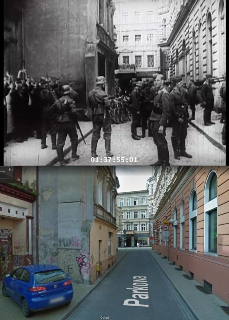Some of the shots in UTW 471 can be geolocated to street locations in present-day Bydgoszcz. Shots 4 to 6 were taken in Parkowa street, just off Gdańska, one of the main thoroughfares in the city center; shot 7 was taken in Farna, an alleyway leading out onto Stary Rynek square. Exploring both streets on a map of Bydgoszcz shows that these sites are approximately half a kilometer apart from each other, separated by the river Brda (Brahe). The footage recorded does not represent a single occurrence, but arrests carried out in different parts of Bydgoszcz.61