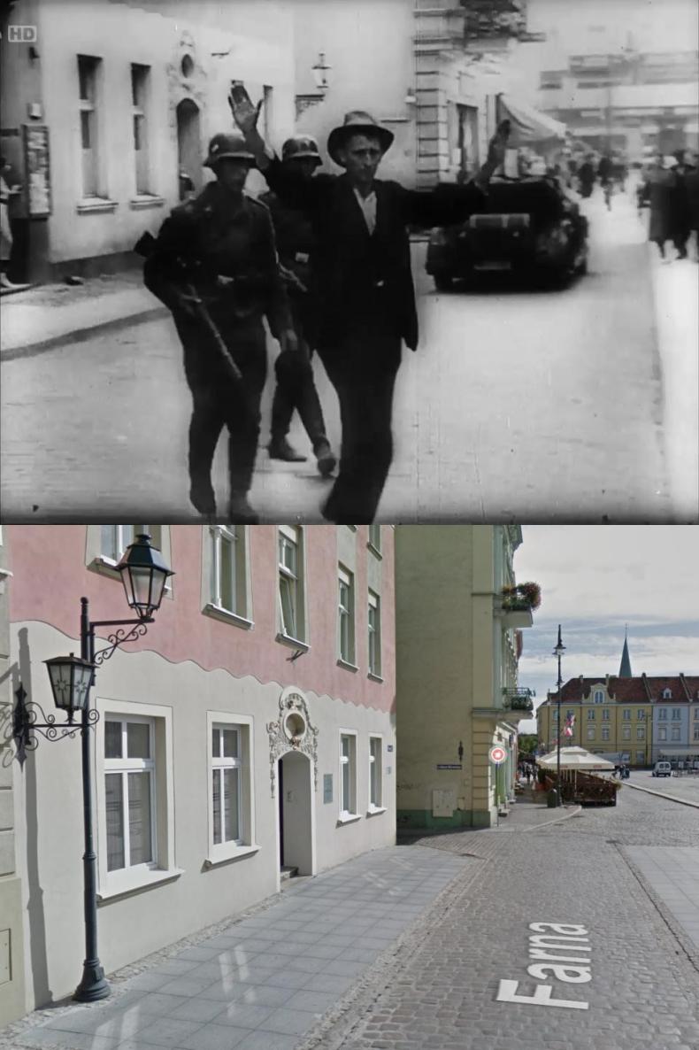 Figures 9–10: Shots 4 and 7 matched to present-day locations in Bydgoszcz. BArch, UTW 471 / Google Maps. Farna leads out onto the Stary Rynek (Old Market) square, where executions took place.