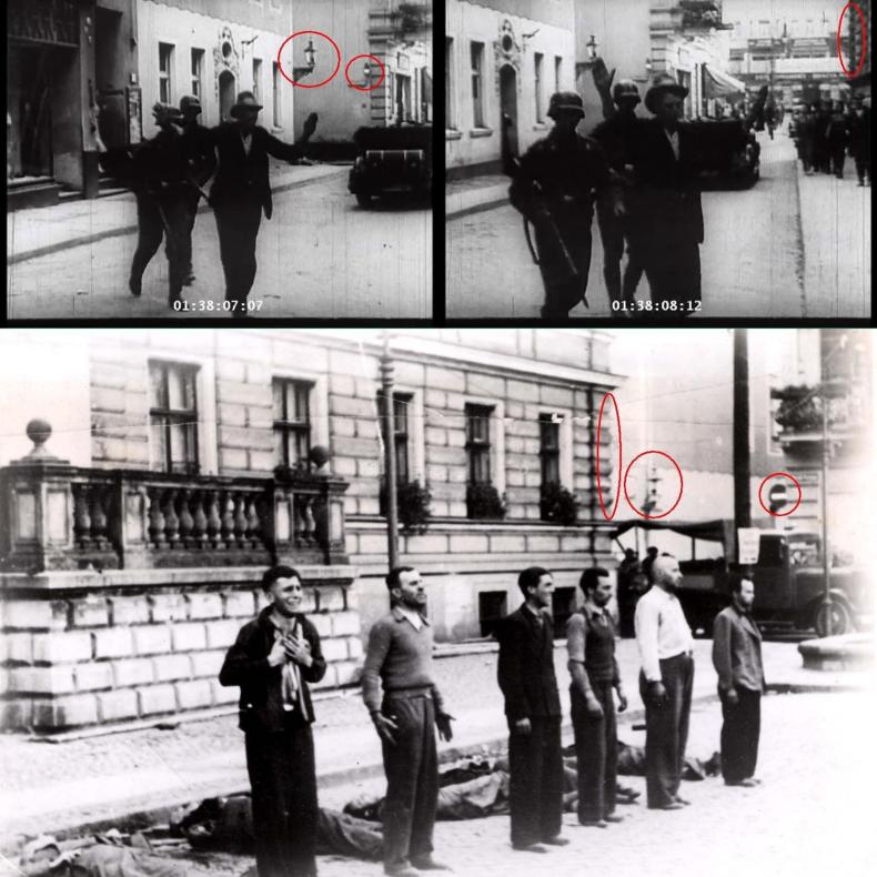 Figure 11: Street signs, lanterns and wall features seen in shot 7 can be matched to much-publicized photographs of the executions in the Stary Rynek (Old Market) square, just around the corner. While the executions can be dated to September 9, 1939, it is uncertain whether footage and photographs were taken on the same day.