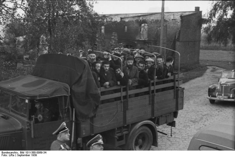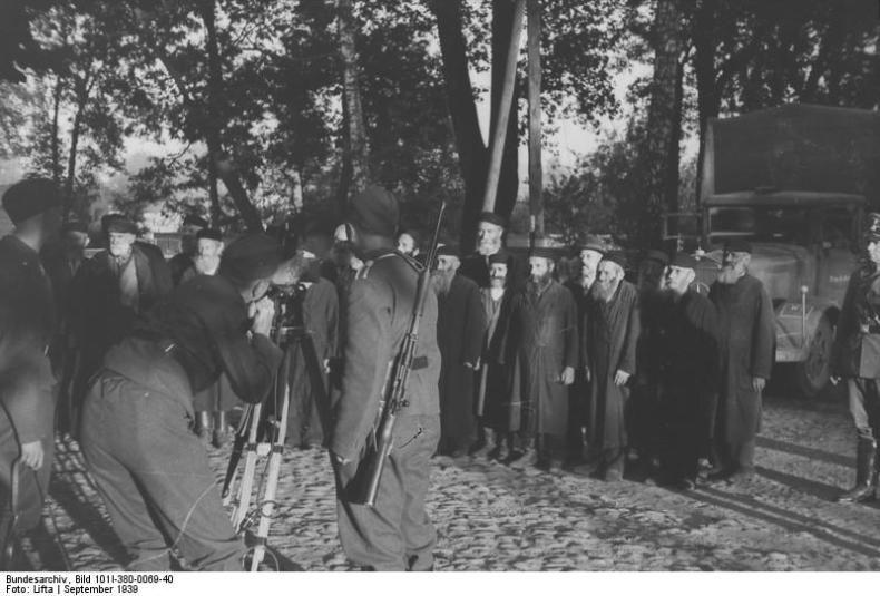 The footage from Bydgoszcz in UTW 471, running to approximately thirty seconds, is immediately followed by another thirty seconds showing Jews marching along a dusty road and being transported on trucks. Members of an SD Einsatzgruppe unit can be seen accompanying the transport. A final sequence of shots consists of elderly Jews being paraded in front of the camera. The voice-over strongly insinuates that the events in Bydgoszcz – the Blutsonntag, and in fact the war itself – were the result of Jewish subversion, a long-established anti-Semitic stereotype.