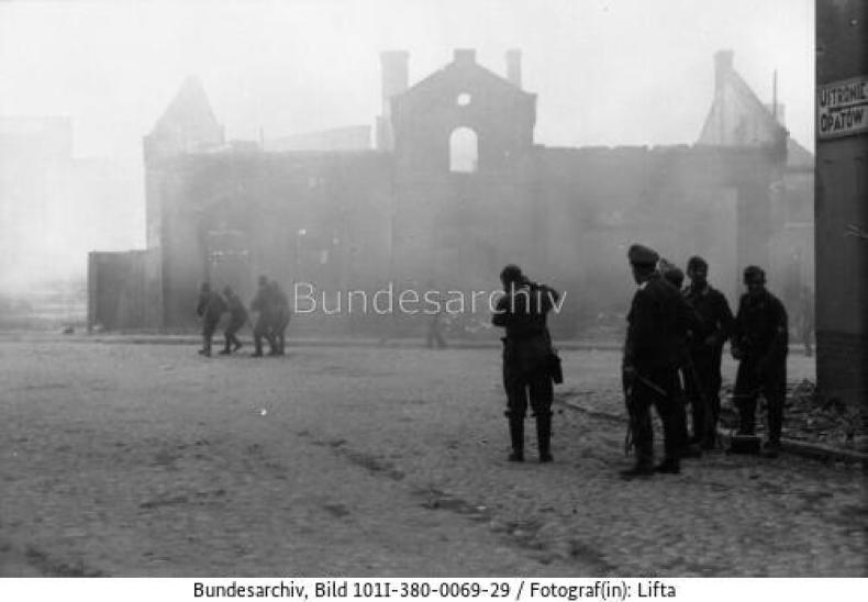 Figure 16: One of the photographs of PK photographer Lifta, probably taken in the town of Wieruszów. Distances to the villages of Ustronie and Opatów are given on a sign on the wall to the right. Lifta also photographed the Jews-on-trucks scene and the line-up of Jews in front of a PK film crew, detailed above, which immediately follow his photographs from this street crossing, all on the same roll of film. Bundesarchiv, Bild 101I-380-0069-29.